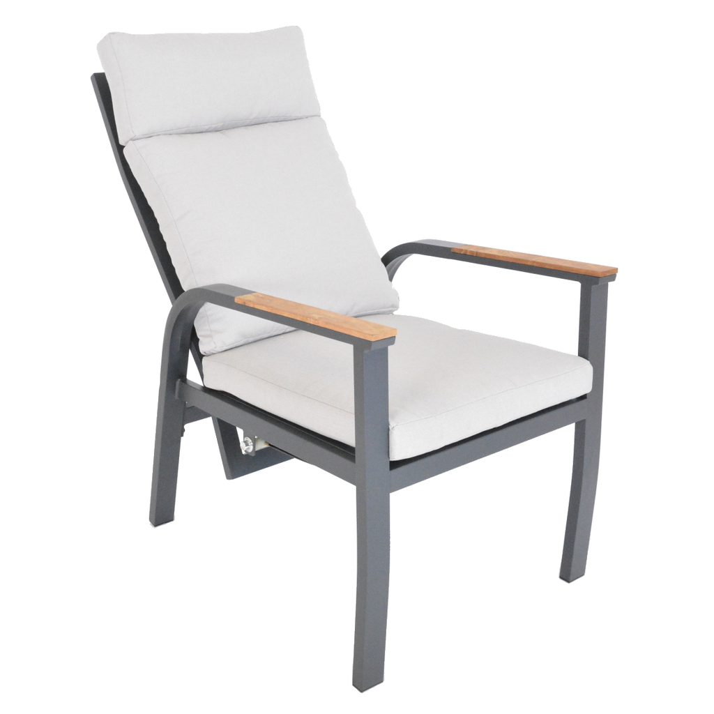 Výhodou hliníka je jeho super jednoduchá údržba, stačí utrieť vlhkou handričkou. Hliník je najodolnejší voči vplyvom počasia, navyše je veľmi ľahký, čiže ho môžete prenášať úplne bez problémov. Pohodlné vankúše z polyesteru (s gramážou 250 g/m2) s penovou výplňou (10 cm) sú odolné voči UV žiareniu. Všetky vankúše sú vybavené zipsami, ktoré umožňujú jednoduché odstránenie polyesterového poťahu. Vrchná časť podrúčiek a doska stola je vyrobená z teakového dreva.