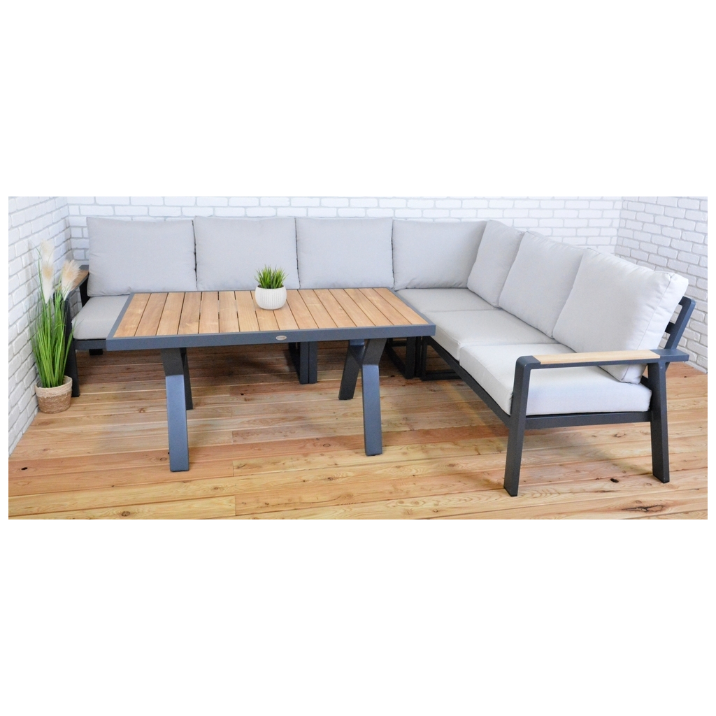 Luxusná hliníková súprava ROTTERDAM v grafitovej povrchovej úprave s podrúčkami a doskou stola z teakového dreva obsahuje rohovú pohovku a praktický stolík. Moderná súprava, ktorá sa dokonale hodí do každého exteriéru alebo interiéru. Vďaka použitým materiálom a modernému vzhľadu má súprava naozaj široké možnosti použitia, je vhodná do interiéru aj exteriéru - do záhrad, na terasy, do zimných záhrad alebo aj do uvítacej haly či recepcie. Vďaka jednoduchej montáži budete môcť súpravu po chvíli naplno využívať. Dištančný prvok možno umiestniť na ľavú alebo pravú stranu, a tak meniť dĺžku pravej alebo ľavej časti podľa vašich potrieb. Súčasťou setu je 2x pohovka (ľavá a pravá), 1x rohová pohovka, 1x rozkladacia pohovka, 1x stolík.