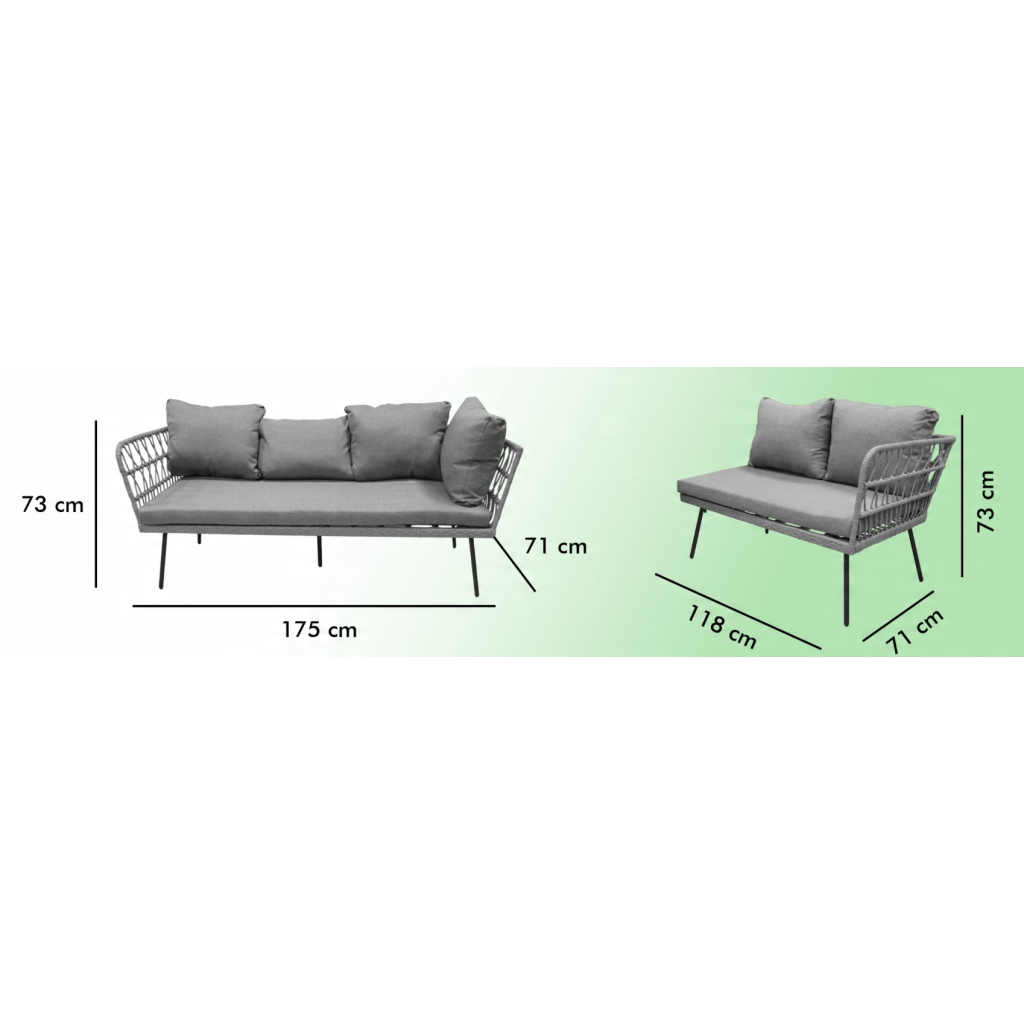 Konštrukcia nábytku je vyrobená z pozinkovanej ocele, ktorá je pevná, odolná a chránená proti korózii. Ratan je vyrobený z kombinácie okrúhleho a plochého výpletu, čo mu dodáva moderný vzhľad a zároveň zvyšuje jeho odolnosť. Podušky majú poťah z vodoodolného polyesteru s gramážou 170 g, ktorý pomáha chrániť výplň pred vlhkosťou. Výplň podušiek tvorí lepená bavlna nanášaná striekaním s hmotnosťou 900 g a hrúbkou 8 cm, čo zabezpečuje vysoký komfort sedenia. Doska stolíka je z tvrdeného skla s hrúbkou 5 mm, ktoré je odolné voči poškriabaniu a bežnému poškodeniu. Syntetický ratan je odolný voči UV žiareniu, dažďu aj bežným nečistotám.