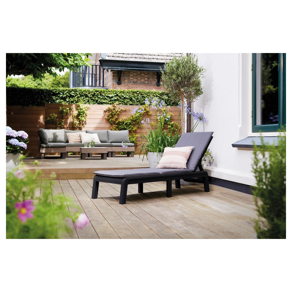 Záhradné lehátko BALEARY v garfitovej farbe so svetlosivým podsedákom je navrhnuté tak, aby poskytovalo maximálne pohodlie a relaxáciu. Kombinuje moderný dizajn s praktickosťou, ponúka výnimočný zážitok z odpočinku. Disponuje štyrmi nastaviteľnými polohami, ktoré umožňujú prispôsobiť ho individuálnym potrebám užívateľa, čím zaručuje jedinečný komfort. Mäkké vankúše, ktoré sú jeho súčasťou, pridávajú na pohodlí a robia relax ešte príjemnejším. Elegantný a štýlový vzhľad lehátka bez problémov zapadne do každého priestoru, pričom mu dodá moderný a sofistikovaný charakter.