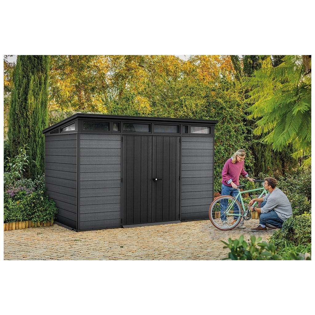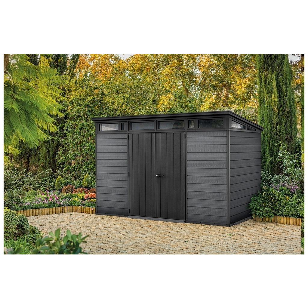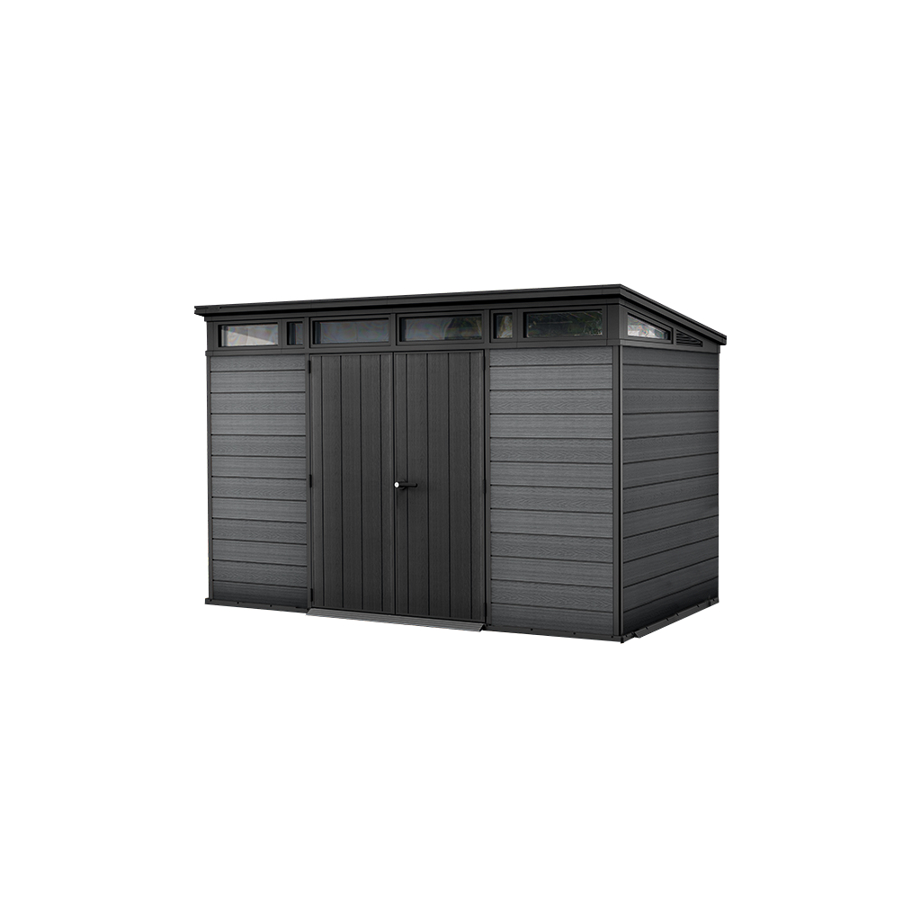 Záhradný domček AMPEZZO 9X7 je vyrobený z kvalitného plastu EVOTECH, ktorý autenticky napodobňuje štruktúru prírodného dreva. Strecha je dodatočne vystužená oceľovým rámom, takže vydrží zaťaženie snehom až 100 kg/m2. Robustný podlahový panel vyžaduje minimálnu údržbu, čo z neho robí praktickú a estetickú voľbu.