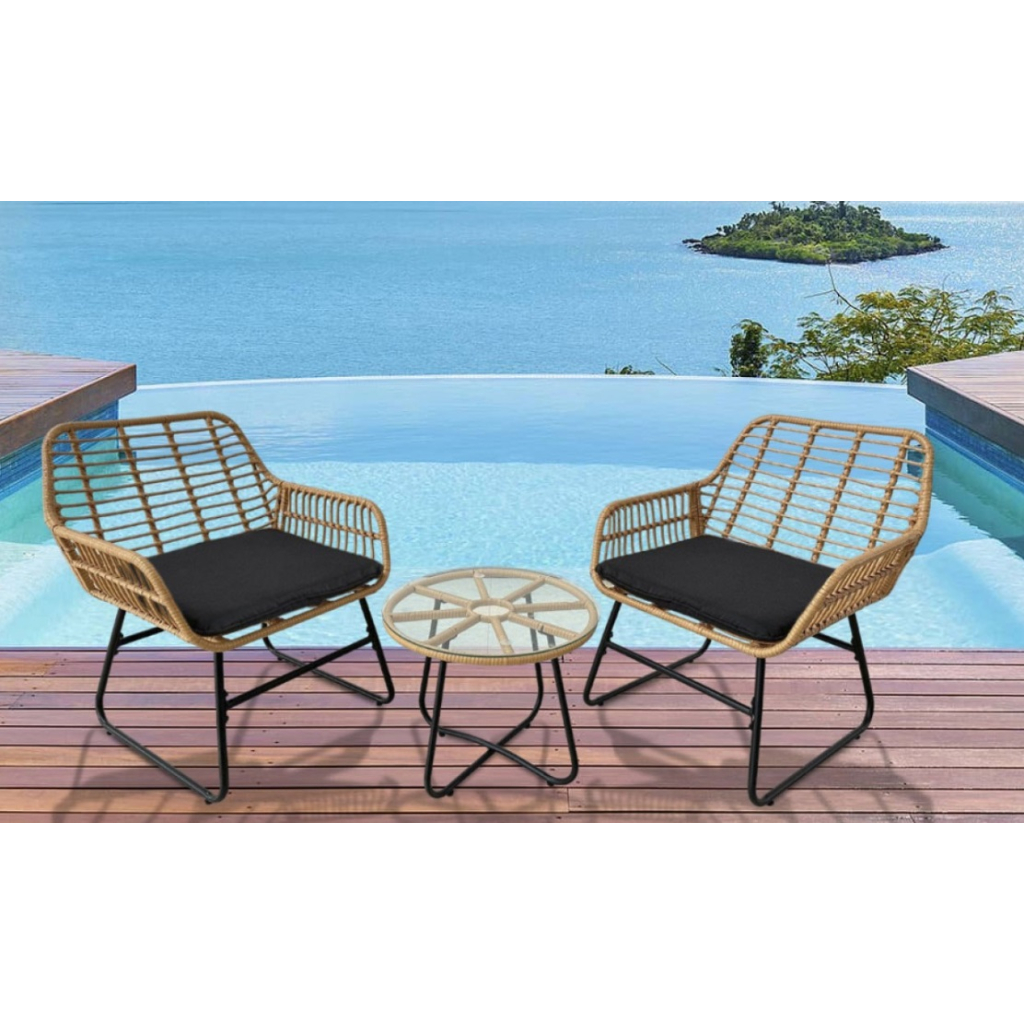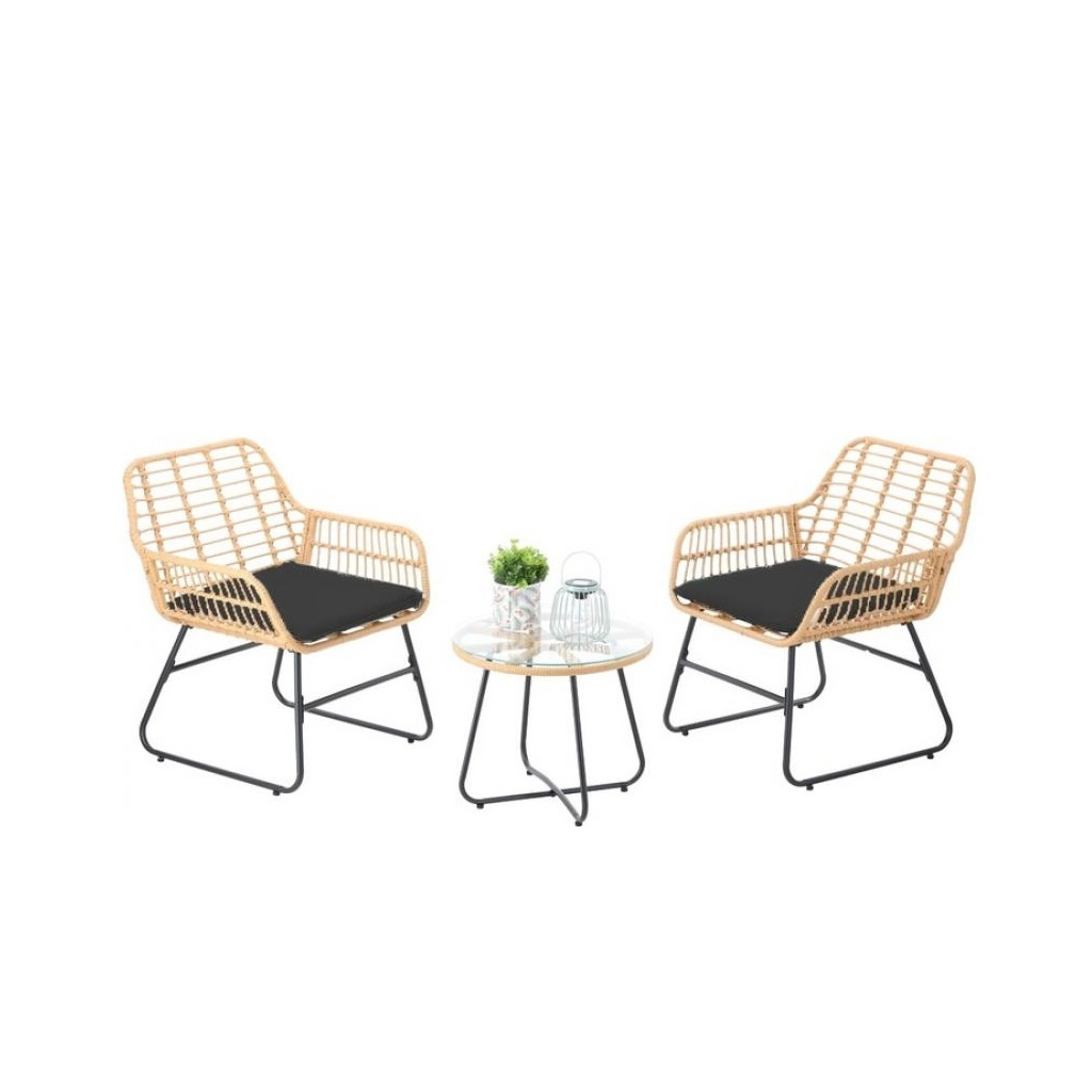 Konštrukcia stolíka a stoličiek je vyrobená z kvalitných materiálov, ktoré sú odolné voči poveternostným podmienkam a zabezpečuje dlhú životnosť. Sedadlá stoličiek sú z kvalitného ratanu, pevného a pohodlného materiálu odolného voči slnečnému žiareniu a vlhkosti. Doska stolíka je tvrdené sklo odolné voči poškriabaniu a ľahko udržiavateľné.