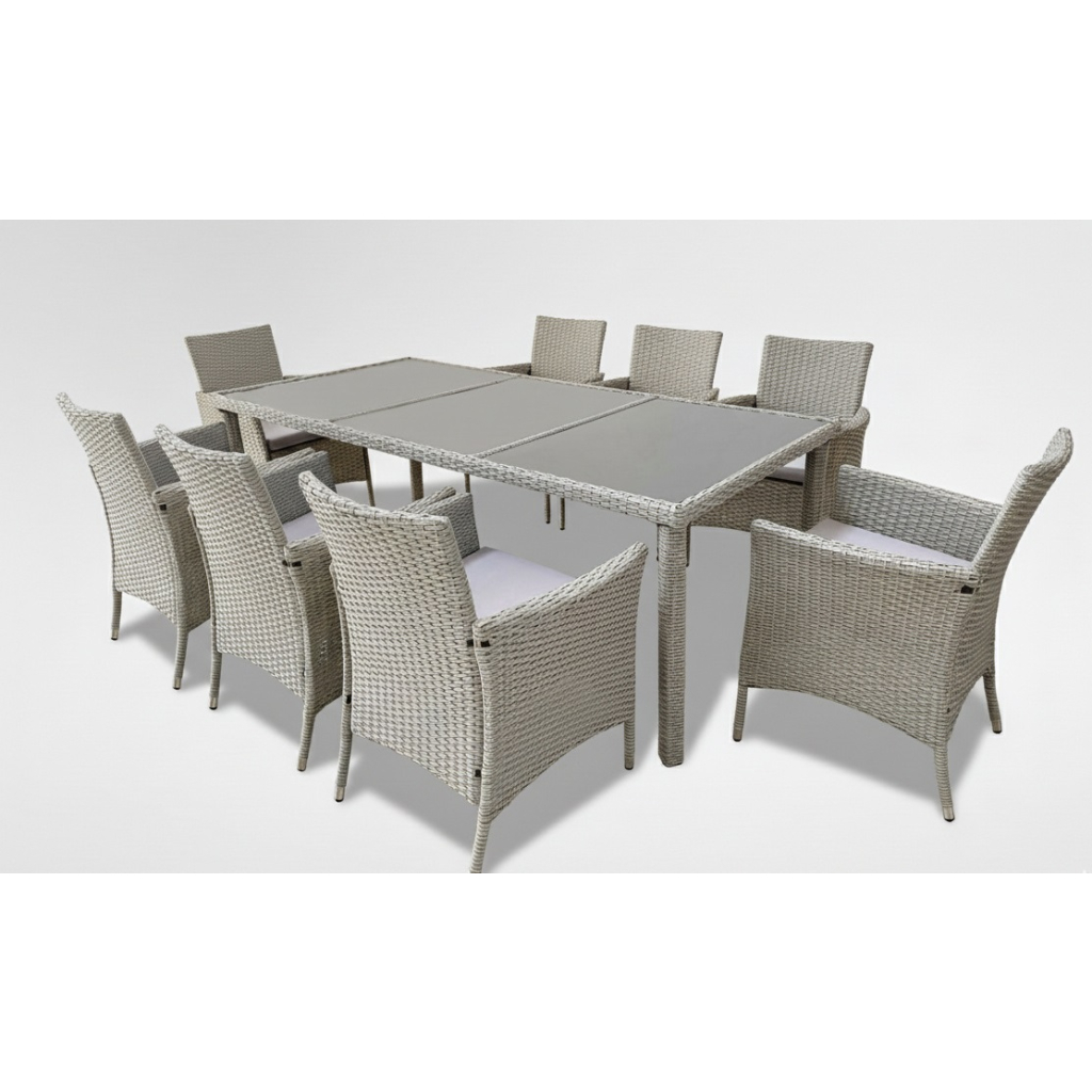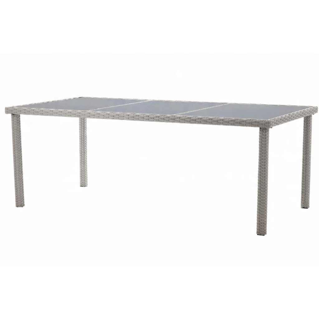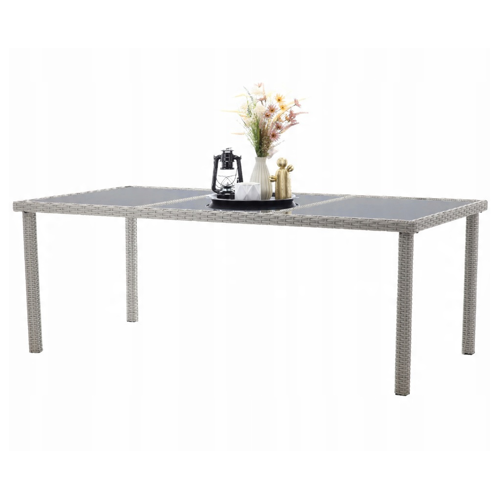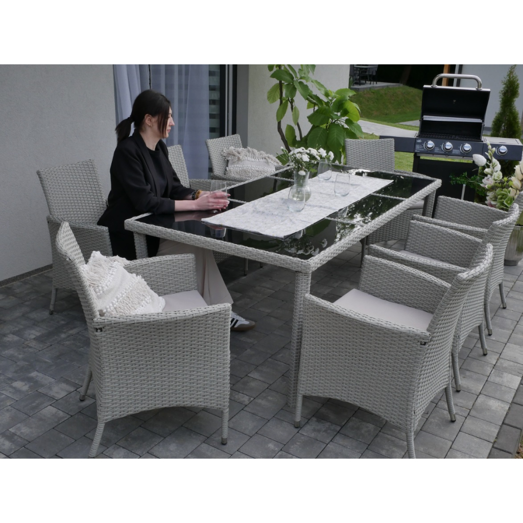 Elegantný záhradný set RESTUS je vyrobený v sivom farebnom prevedení, má pevné a odolné prevedenie s moderným a originálnym dizajnom. Tento elegantný záhradný set je základnou výbavou každého dvora alebo terasy. Zostava pozostáva z veľkého stola a 8 pohodlných stoličiek, čo umožňuje príjemné posedenie až pre 8 osôb. Stolík má širokú dosku, ktorá je ideálna pre rodinné obedy či záhradné oslavy, a jeho moderný dizajn dopĺňa ratanový vzor a sklenený povrch z tvrdeného skla hrúbky 5 mm.