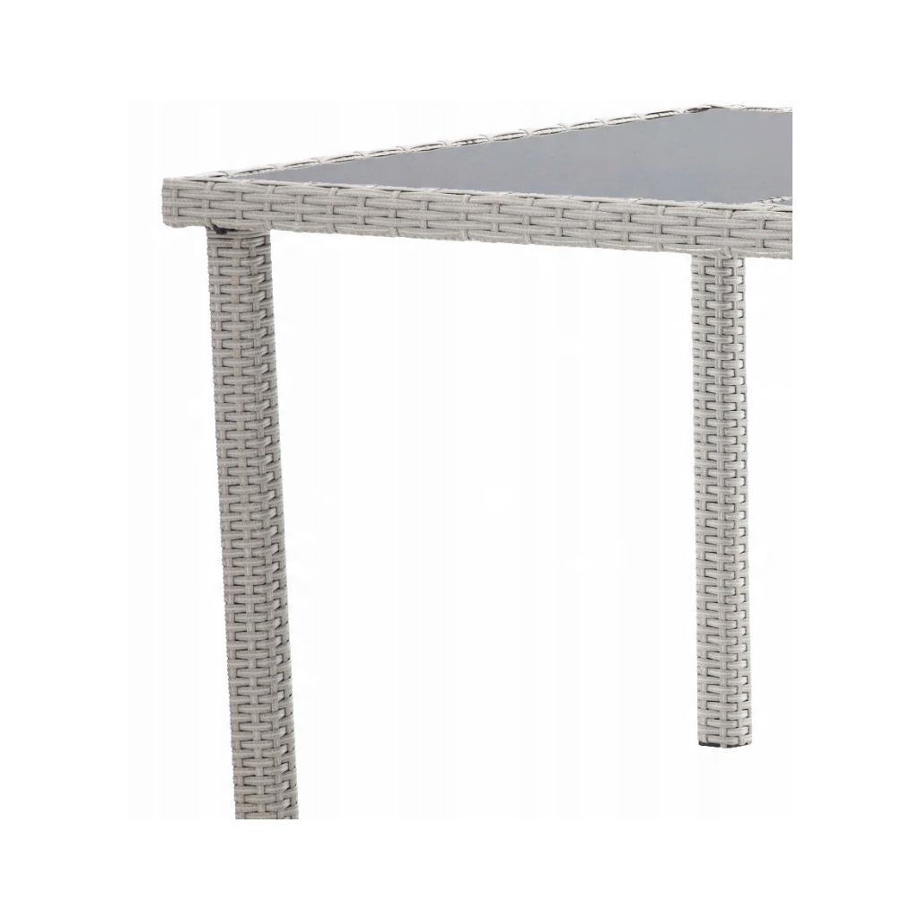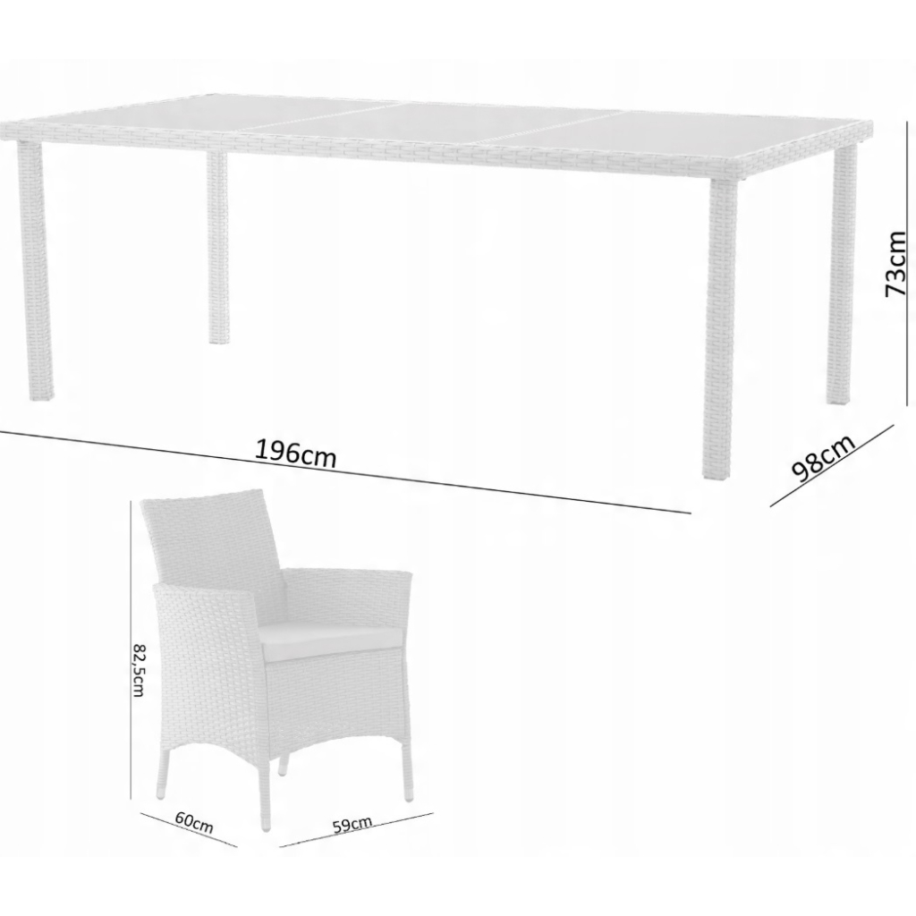 Nábytok je vyrobený z kvalitnej pozinkovanej oceľovej konštrukcie, ktorá zaisťuje stabilitu a dlhú životnosť celej zostavy. Výplet stolov a stoličiek je z technoratanového materiálu odolného, UV stabilizovaného a vodeodolného syntetického ratanového vlákna, ktoré odoláva vonkajším vplyvom a zachováva si farbu po mnoho rokov. Podušky sú pokryté vodeodolným polyesterom a vyplnené penou hrubou 5 cm, čo poskytuje pohodlné a komfortné sedenie. Sklenená doska stola je vyrobená z tvrdeného skla hrúbky 5 mm, ktoré je pevné, odolné a bezpečné pri každodennom používaní.