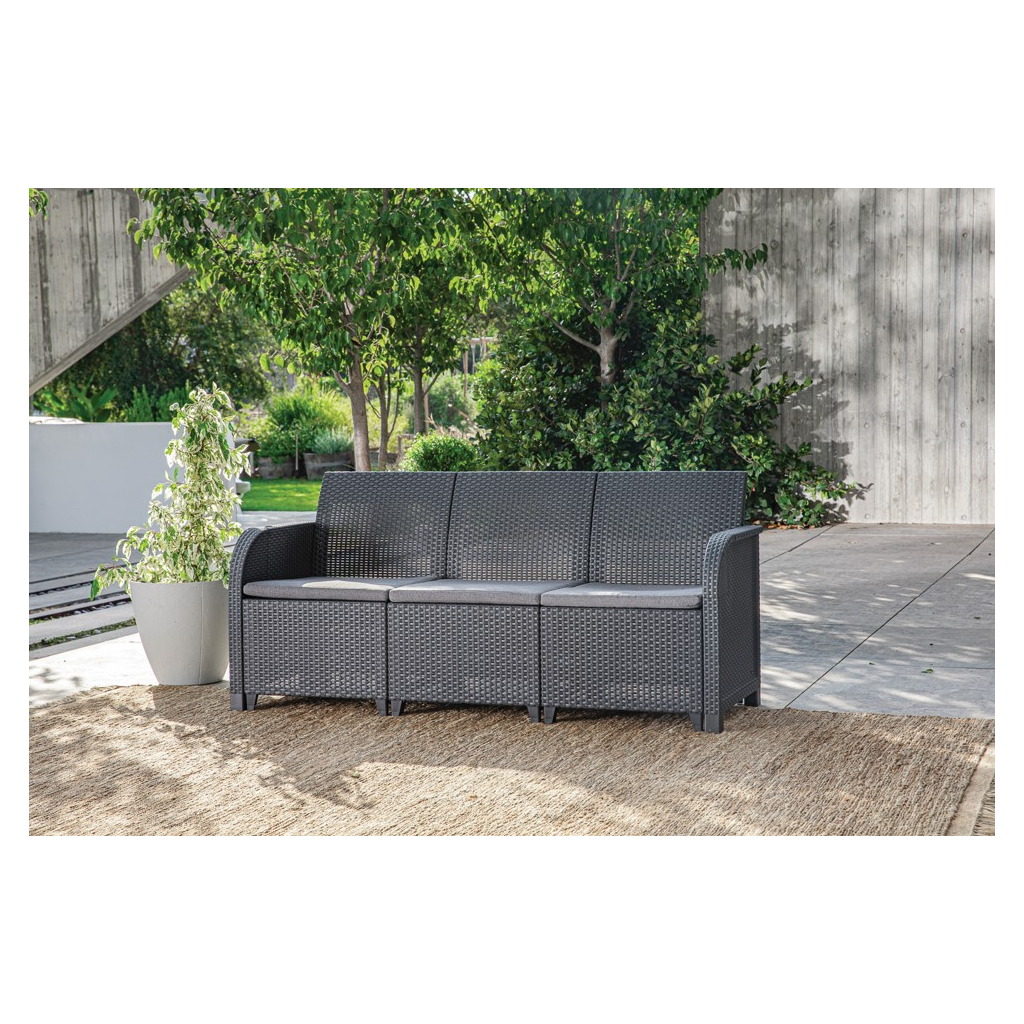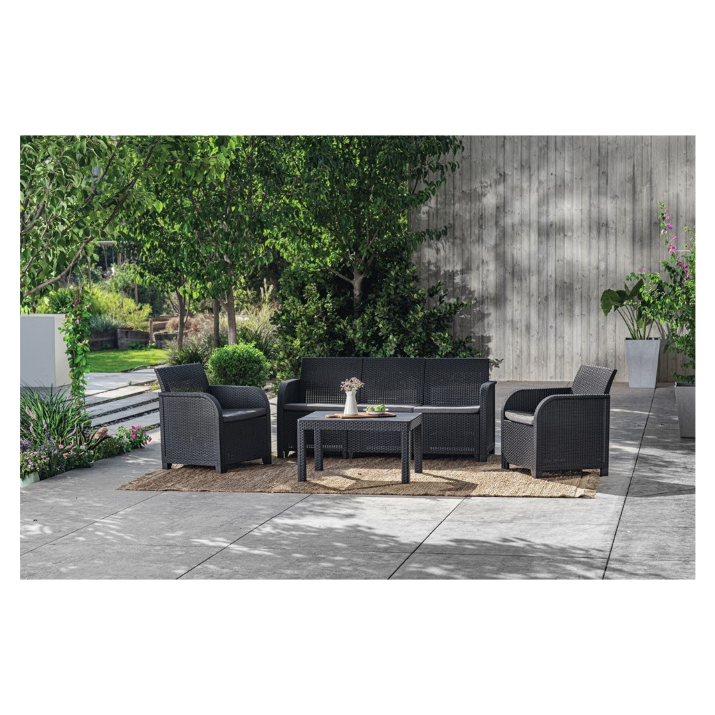Záhradný set ROSELYN 5 big table je vyrobený z lisovaného plastu v imitácii prírodného ratanu. Elegantná zostava záhradného nábytku skvelo doplní každú záhradu a urobí z nej výnimočné miesto. Vďaka modernému a pohodlnému setu ROSELYN premeníte svoju terasu alebo balkón na miesto oddychu a relaxu. Vankúše, ktoré sú súčasťou súpravy, vám poskytnú pocit pohodlia počas chvíľ odpočinku. Súprava sa skladá z 3-miestnej pohovky, 2 kresiel a stola.