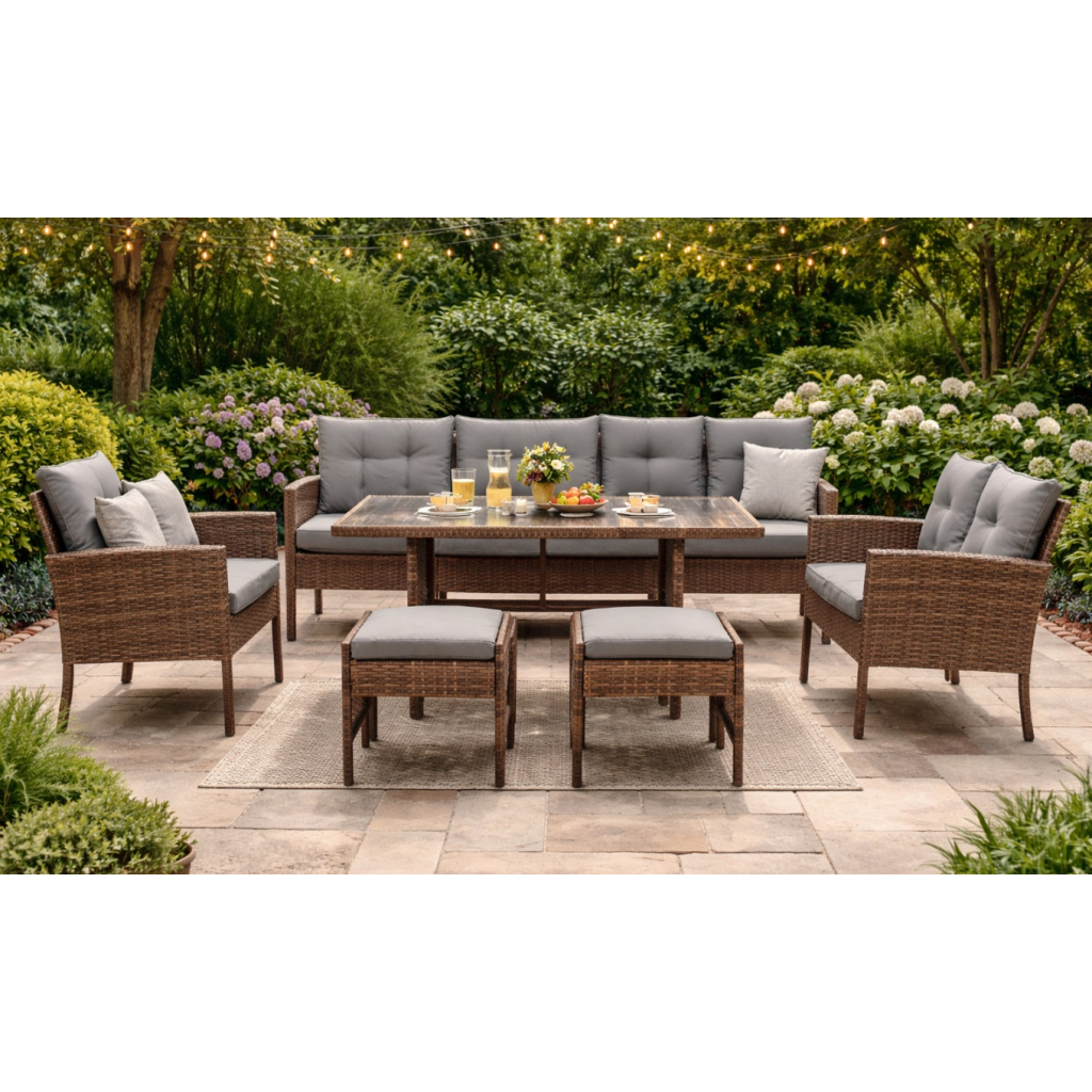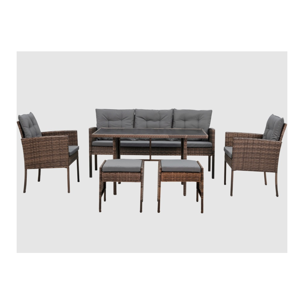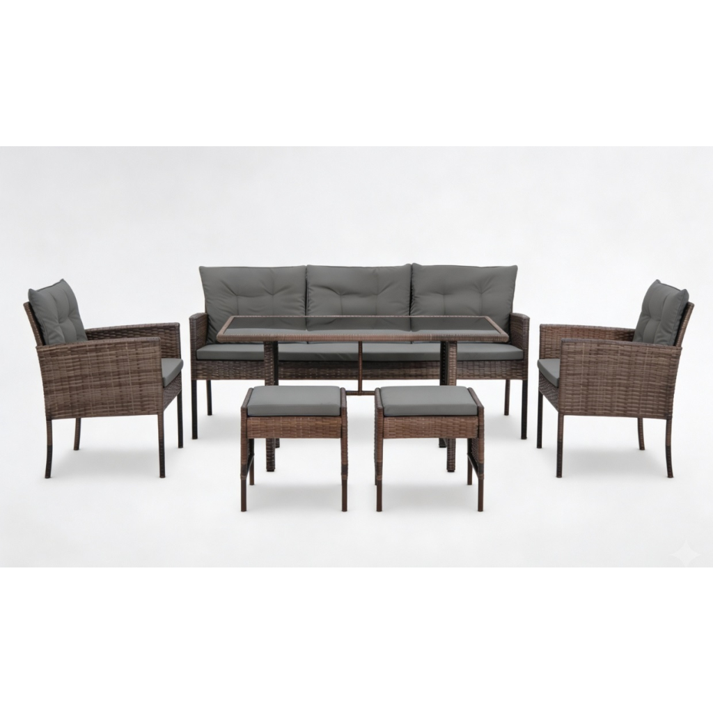 Konštrukcia setu je vyrobená z ocele s práškovou povrchovou úpravou, ktorá zabezpečuje odolnosť proti korózii a dlhú životnosť. Výplet je z plochého technoratanového materiálu, ktorý je pevný, estetický a vhodný na vonkajšie použitie. Podušky majú hrúbku 5 cm na sedadle a 7 cm na operadle, sú vyrobené z kvalitného polyesteru a poskytujú pohodlné a komfortné sedenie. Stolík je vybavený doskou z tvrdeného skla, ktorá dopĺňa elegantný vzhľad setu a uľahčuje jeho údržbu.