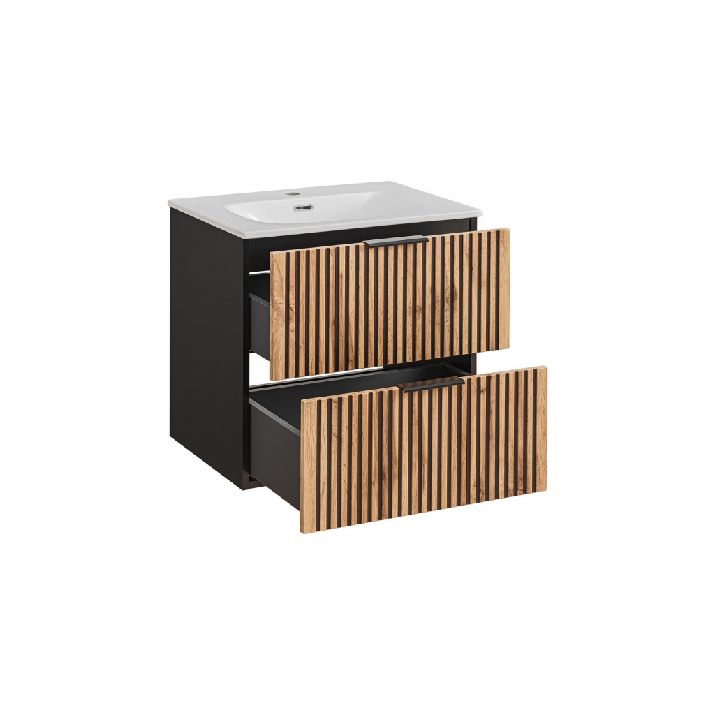 Moderná kúpeľňová skrinka s umývadlom XILO U60/2 v dekore dub wotan to nie je len kvalita a moderný dizajn, ale aj pohodlie a funkčnosť. Výrazný dekor dreva dub wotan v kombinácii s čiernym drážkovaním je novinkou na trhu s nábytkom, ktorá je čoraz obľúbenejšia. Vďaka kvalitným materiálom a modernému prevedeniu vám dlho bude robiť radosť.